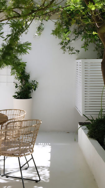 L’extérieur de cette petite maison marseillaise, située à Endoume, devait être entièrement repensé, pour devenir plus moderne. Déjà structuré de par sa forme, le parti pris était de mêler la Méditerranée, et sa mer à deux pas, avec les influences du Japon, chères aux propriétaires. Les codes japonais (Érable japonais, zellige écaille de poisson noir, barbecue Kamado, le voile bateau, etc.) se retrouvent en douce harmonie avec les murs blancs, les poteries en terre blanche le béton ciré 'Roucas'. Un extérieur de 30m2, tout en douceur.